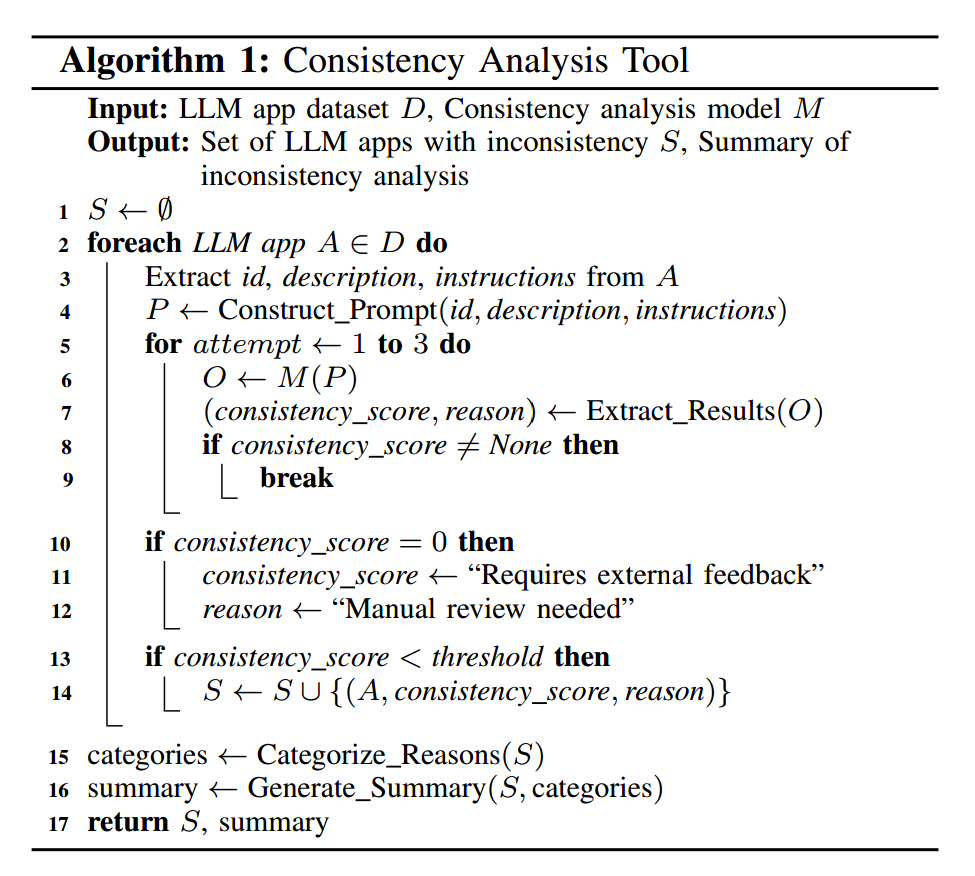 内容不一致(Content inconsistency). 我们基于 Llama3-8B [35] 开发了一个一致性分析工具(见 Algorithm 1),将每个 LLM 应用的描述与 指令(instructions) 作为输入。