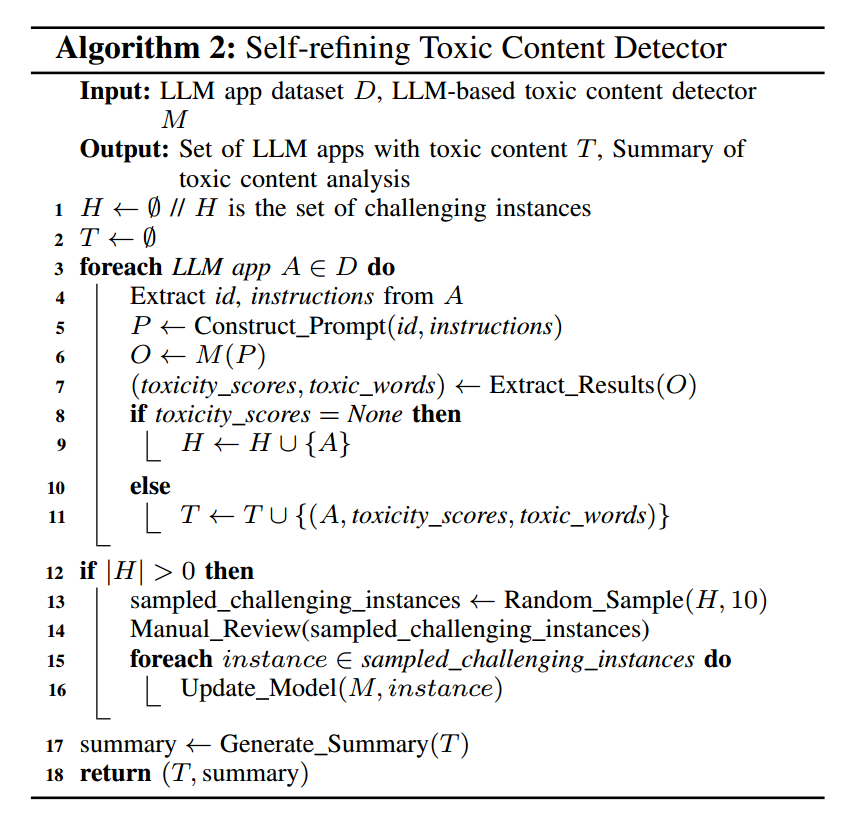 该流程以我们构建的 ToxicDict 为起点进行初始检测。对每个 LLM 应用的描述与指令进行扫描,检测算法通过字符串匹配与正则表达式检查词典中有害词是否出现。该方法直观且稳健,可在不引入语义歧义、也不因过于复杂的转换规则而导致行为误判的前提下,准确识别有害词。