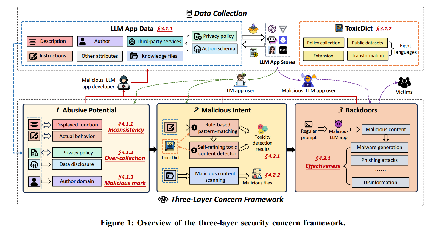 我们开展了首个关于 LLM 应用商店安全问题的全面实证研究。提出一个新颖的三层关注框架用于 LLM 应用安全分析,覆盖:具有滥用潜力的应用、具有恶意意图的应用、以及带有后门的应用。