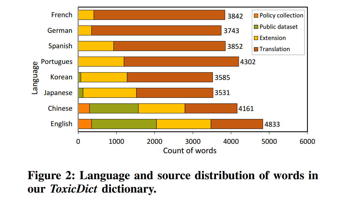 这些类别的选择参考了各 LLM 应用商店的政策以及 OpenAI 的 Moderation 接口 [44],以确保对有害内容类型的全面覆盖——从仇恨言论、自伤内容到隐私违规与垃圾信息。图2 展示了 ToxicDict 中词语的语言分布与来源。词典囊括了来自八种语言的词汇,这些语言是基于它们在 GPT Store [42] 中 LLM 应用里的普遍性而选定的。具体来源包括: