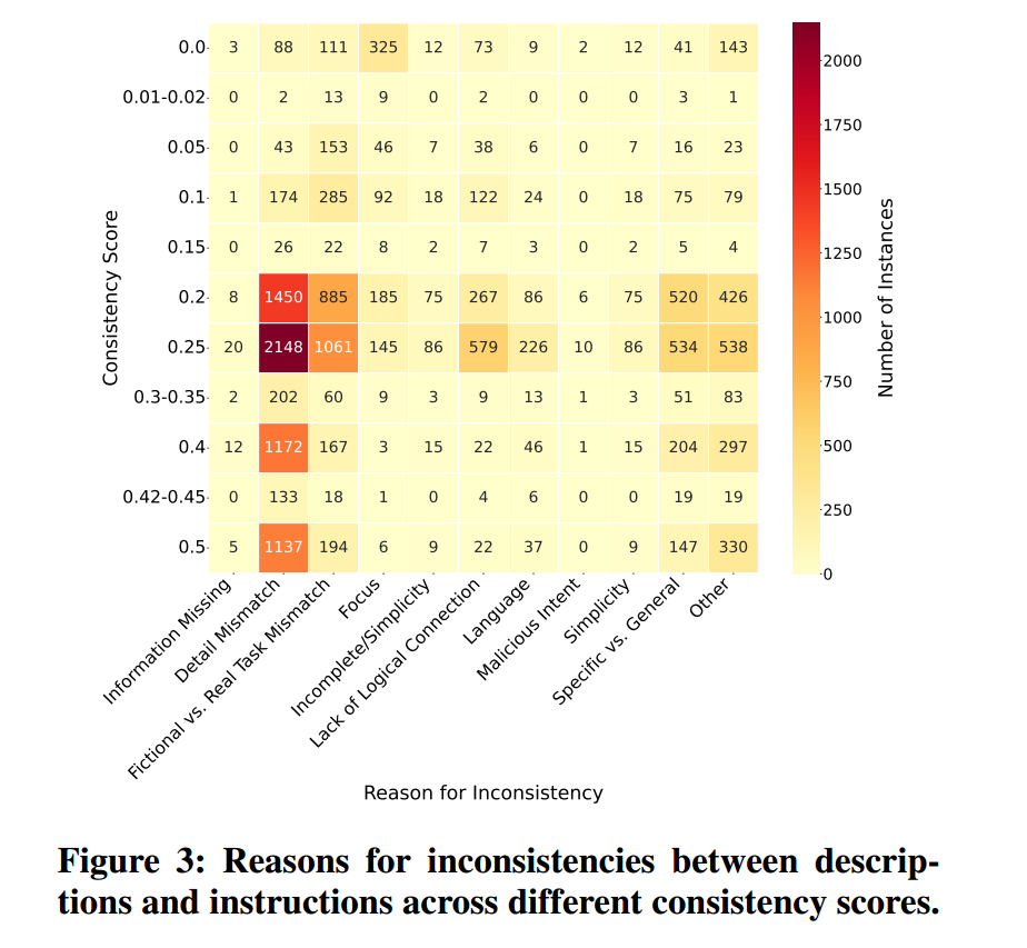 该工具评估“描述”与“指令”之间的一致性,考量相关性、细节对齐、任务连贯性等因素;并给出 的一致性分数( 表示完全无关, 表示完全一致)。我们以 为步长手动设定阈值,并为每个区间提供示例引导模型学习。工具还会给出评分理由以便分析。输出通常是 JSON,字段包括 id、consistency_score 与 reason。若工具未能给出正确输出,会在最多三次内重试;仍失败的样例将被标记用于人工复核。我们通过抽样验证其准确性,并据此调整提示词以优化性能。评估表明该工具可靠,误报率约 7%。完成检测后,我们会对不一致的原因进行分类并输出分析摘要。此分析对审计潜在滥用至关重要,因为不一致既会误导用户,也可能掩盖恶意意图。
