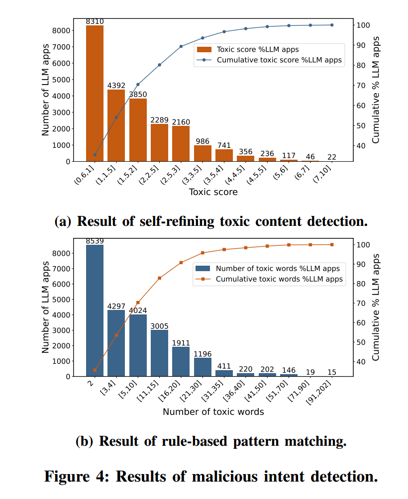 回顾 §4.1,我们发现 34.6% 的受检应用在描述与指令之间存在差异,这往往揭示了隐藏的恶意意图。这些差异仅从应用描述中并不明显。因此,我们把检测恶意意图的重点放在成功获取到指令的 57,317 个 LLM 应用(见表2)上——这些指令相当于决定应用行为的“源代码”。为全面检测所有包含恶意意图的 LLM 应用,我们采用了两种方法(见 §3.3):自迭代的 LLM 毒性内容检测与基于规则的模式匹配。