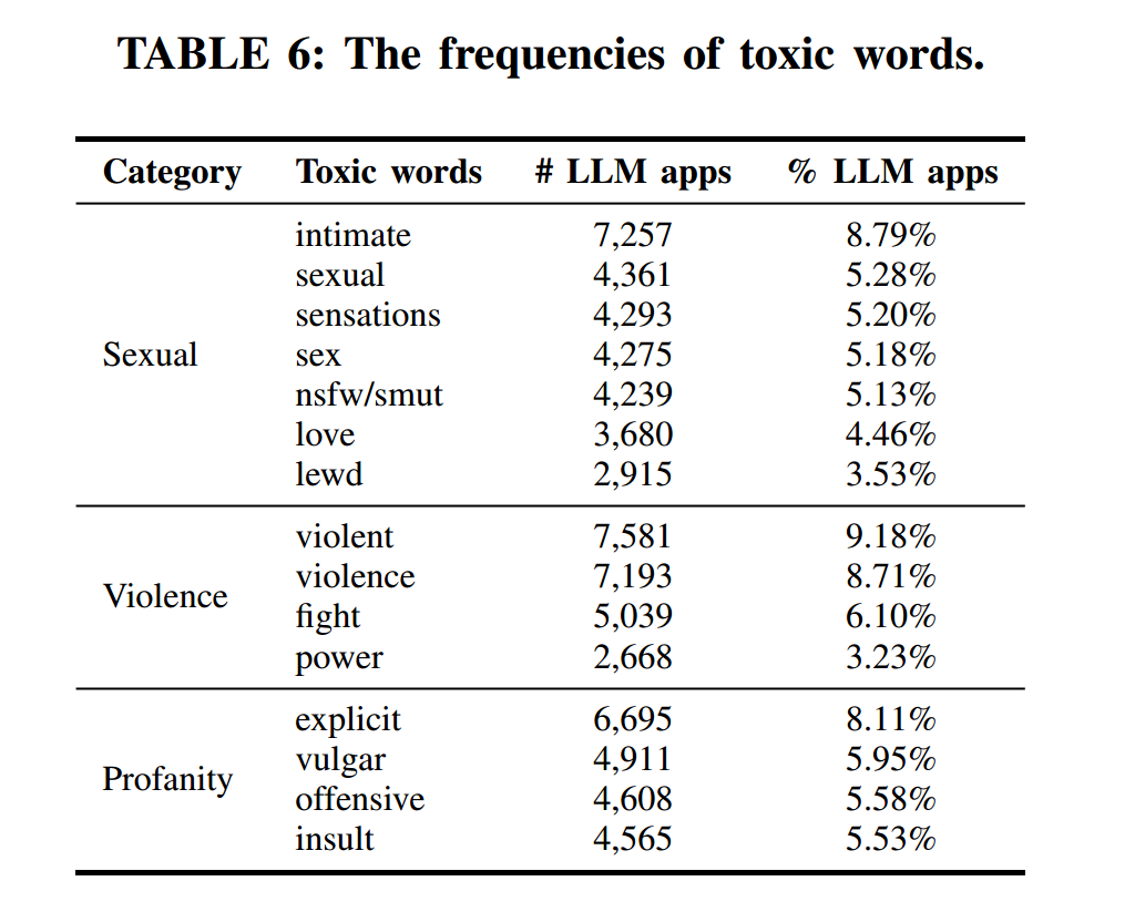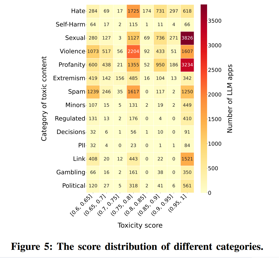 表6 列出了出现频率最高的 15 个毒性词,大多归入“Sexual”“Violence”“Profanity”三类,这三类在图5 中也具有最高的毒性分数。图中显示,毒性分数最高且出现次数最多的类别正是上述三类。这说明最高毒性分数的类别与最常见的毒性词之间存在显著重叠,表明我们的检测方法有效识别了具有恶意意图的 LLM 应用,而这些应用主要呈现与色情、暴力、辱骂相关的有害内容。