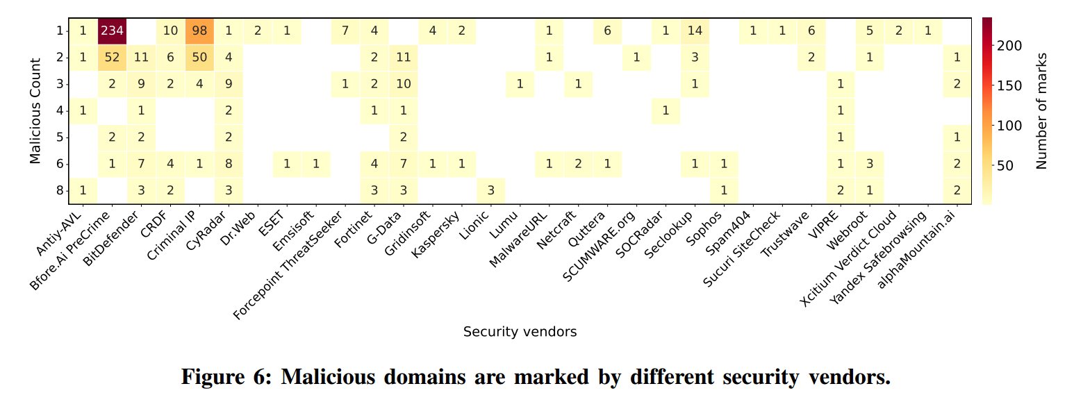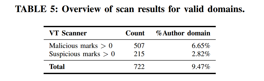 随后,我们使用 VirusTotal 与 Google Safe Browsing 扫描这些作者域名。表5 给出了 VirusTotal 的结果,显示被标记为恶意或可疑的作者域名数量,总计 677 个。附录中的图6 进一步列出了哪些安全厂商将这些域名标记为恶意;不同厂商在扫描时关注点各有不同。Google Safe Browsing 的扫描结果显示:所有作者域名均被标记为“干净”。