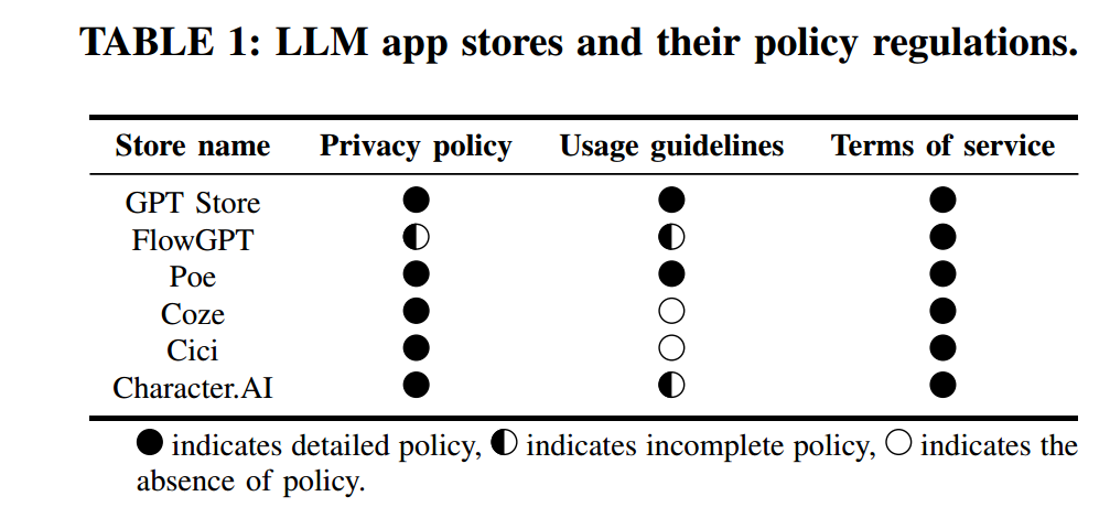 另外,与传统应用通常提供其自身的隐私政策(详细说明权限、数据收集与使用)不同 [65]、[74],LLM 应用的开发者在使用第三方平台时,往往只提供第三方平台的隐私政策。这使用户难以了解其数据在 LLM 应用内部究竟如何被处理,凸显了 LLM 应用生态在透明度与用户保护方面的缺口。