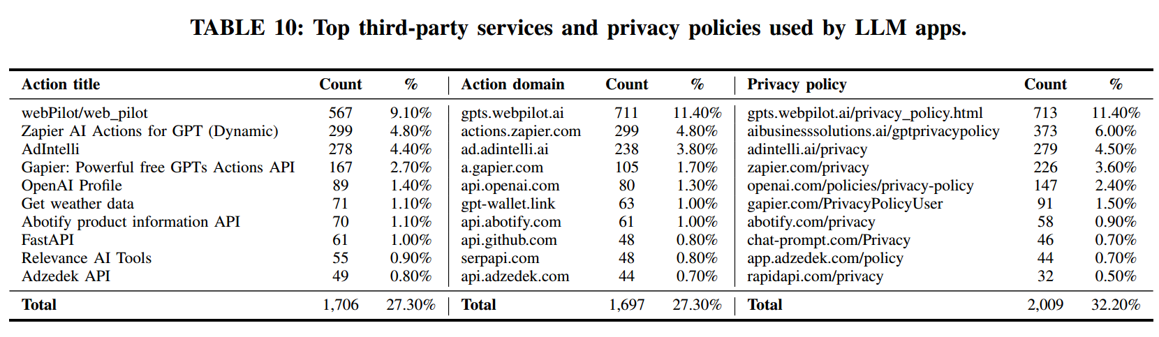 我们收集了 5,498 个 LLM 应用使用第三方服务(Actions)的情况。附录中的表10给出了最常见的 10 个 Action 标题、Action 域名(domain)以及隐私政策的分布,并以占总体 Actions 的比例表示。按理,这三者应一一对应且数量相近。然而,表 10 的数据揭示出不一致:当前 LLM 应用商店中的第三方服务使用缺乏标准化。例如,Action 标题与其作用域不一致,或隐私政策与所用 Action 无关。一个醒目的例子是“Get weather data”这个 Action,竟关联了 20 份不同的隐私政策。