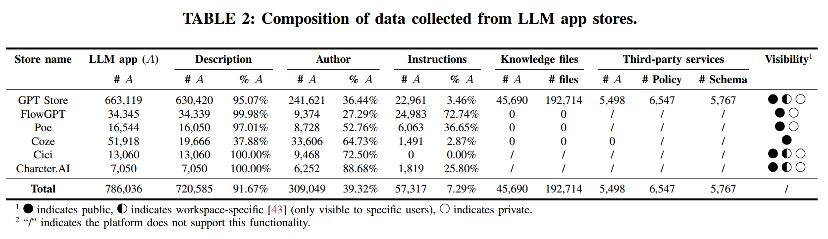 在研究的初始阶段,我们系统性地从多家以托管定制化 LLM 应用而知名的应用商店收集数据。主要数据来源包括 GPT Store [42]、FlowGPT [68]、Poe [54]、Coze [18]、Cici [17] 与 Character.AI [60]。为高效抓取这些来源的数据,我们基于 Selenium [59] 开发了自动化爬虫工具,确保所有抓取操作均遵循各平台的速率限制,以免干扰其正常运行。表2 展示了我们从各 LLM 应用商店收集的数据构成。每个平台的 LLM 应用都有唯一的 ID,因此我们以该 ID 作为应用的标识,用于计数并作为引用依据。