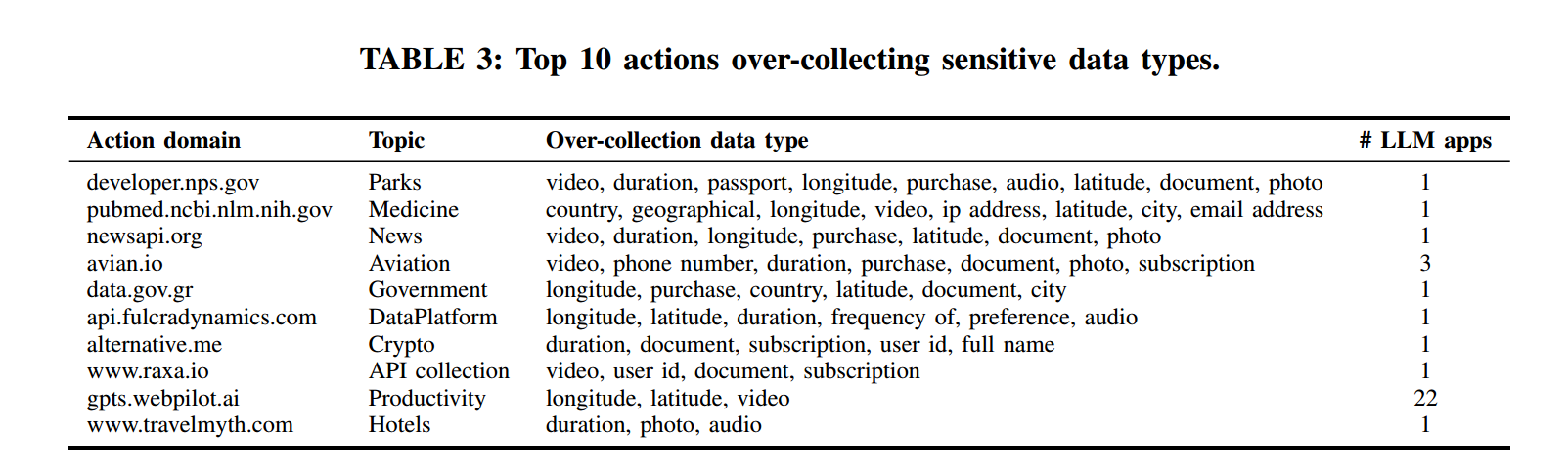 通过分析,我们共发现 1,688 个(29.27%)Actions 过度收集了敏感数据类型。表3 展示了按过度收集的数据类型数量排序的前十个 Actions。除 gpts.webpilot.ai 外,其余 Actions 相对小众且使用频率不高。有趣的是,表10中使用最广泛的 Actions 并未过度收集超过三种数据类型。这表明,尽管敏感数据的过度收集是一个重要问题,但它更多出现在不太知名的 Actions 中,这突出了在 LLM 应用生态中加强对第三方服务的审查与监管的必要性。