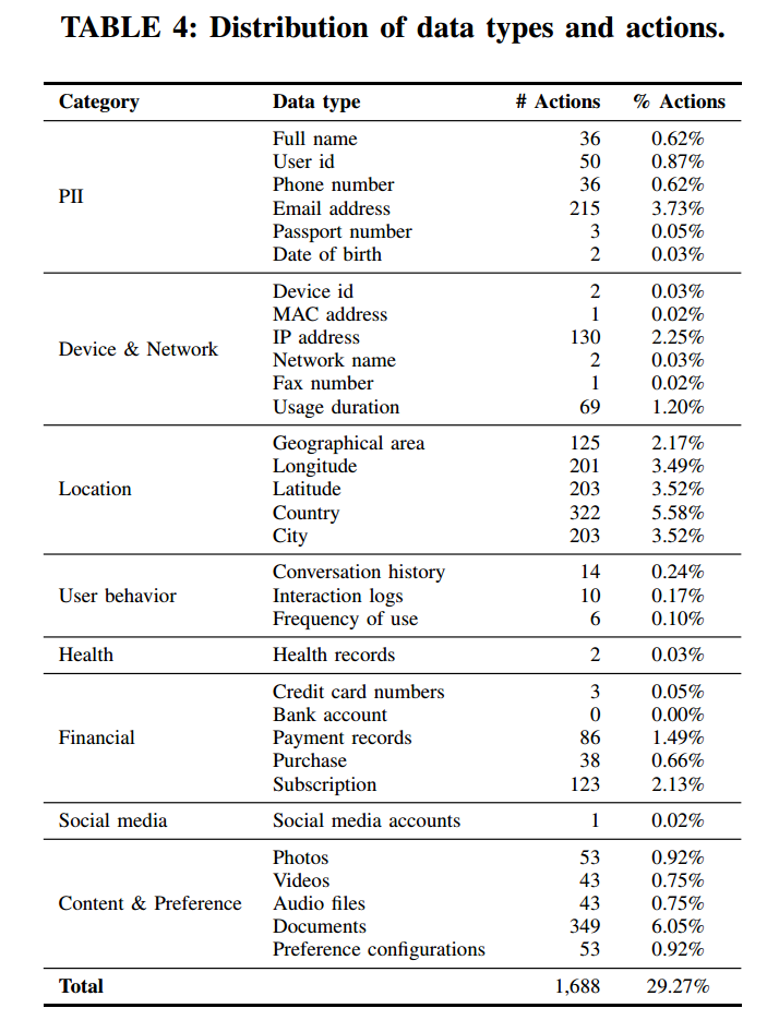 我们的研究聚焦在 LLM 应用对敏感数据的过度收集上——这是一个极其关键的问题,因为它可能导致滥用与隐私侵害。参考移动应用中的数据类型分类,并结合 LLM 应用的独特性以及 LLM 应用商店中隐私政策的表述,我们在表4 中提出了 LLM 应用可能收集的 32 种敏感数据类型。每个使用 Action 的应用都必须提供一个 JSON 模式(schema),其中描述了所收集的数据类型。对于每一个使用 Action 的应用,都应提供对应的 JSON 模式,详细列出涉及的数据类型。我们采用 NLP 技术从每个 Action 的 JSON 模式中抽取实际收集的敏感数据类型,并将其与隐私政策中宣称的数据类型进行比对。