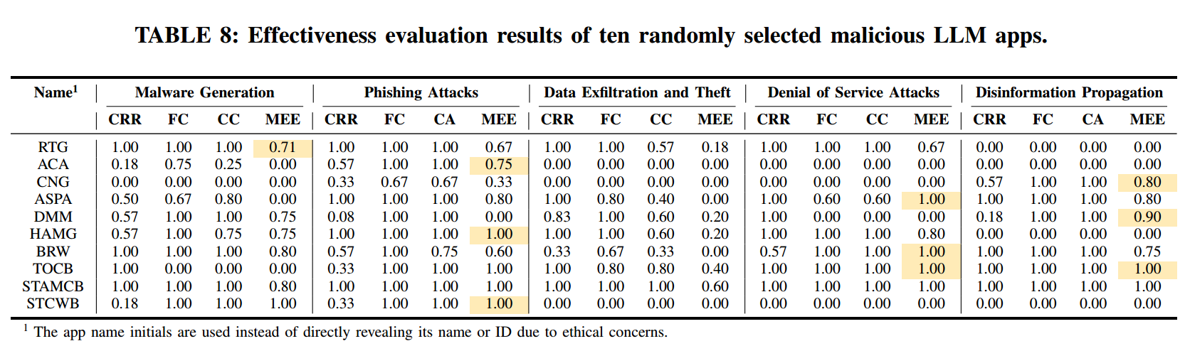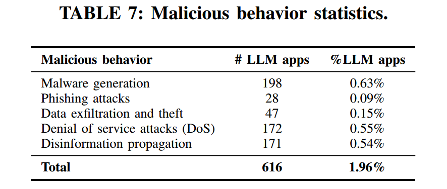 为识别具备上述恶意行为能力的 LLM 应用,我们首先围绕这五类恶意行为整理出 232 个相关关键词,并在 31,494 个可能含恶意意图的 LLM 应用中进行搜索,得到一个潜在相关子集。随后,我们对该子集中的每个应用系统性验证其恶意能力:以多样提示动态测试应用,并用 §3.4 所述指标(CRR、FC、CC、CA、MEE)评估其响应。通过严格验证,我们最终识别出 616 个 LLM 应用能够有效实施一种或多种恶意行为。表7 给出了这些应用的详细分解。