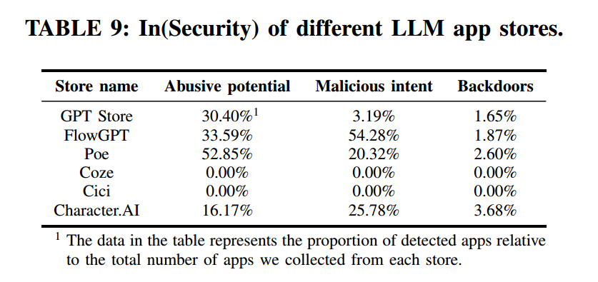 在前文中,我们基于三层关注框架分析了 LLM 应用生态的安全版图。为理解不同 LLM 应用商店之间的差异,我们将分析聚焦于六个具体平台。表9 给出了这些商店中具有滥用潜力、恶意意图与后门的 LLM 应用所占比例。需要强调的是,这些比例相对于被检测到的应用数量计算;例如,在来自 FlowGPT 的 24,983 个 LLM 应用中,有 13,562 个被识别为具有恶意意图,占比为 。