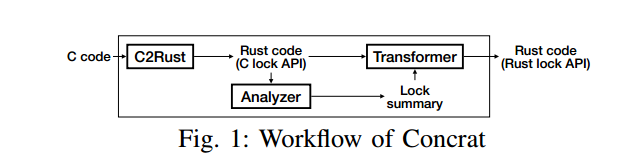 为将 C2Rust 生成代码中的 C 锁 API 替换为 Rust 锁 API,我们提出了 Concrat,它由 C2Rust、一个静态分析器以及一个 Rust 代码变换器 组成 [20]。图 1 展示了 Concrat 的工作流:静态分析器在 C2Rust 生成的代码上执行我们提出的数据流分析,产出一份锁摘要(lock summary),其中描述了数据—锁关系与流程—锁关系;随后,代码变换器依据该锁摘要,将程序中的锁 API 进行替换。