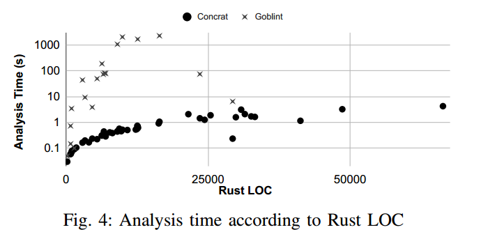 评估结果还表明,我们的分析器相比 Goblint 更具可扩展性且更精确。在 66 KLOC 上,我们的分析器仅需 4.3 s;而 Goblint 因内部错误或 24 小时的超时限制,未能分析 27 个程序,对其余 19 个程序的分析耗时比我们慢 1.1× 至 3923×(见图 4)。我们认定:若分析器给出的锁摘要能使变换器生成可编译的代码,则该分析器是精确的;因为不精确的锁摘要会导致变换后的代码无法编译。在 Goblint 能分析的 19 个程序中,使用我们的分析器时有 2 个变换后无法编译;而使用 Goblint 时有 6 个变换后无法编译。