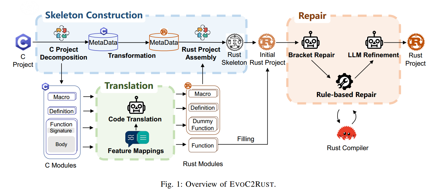 我们提出 EvoC2RUST,一个由 LLM 驱动的整项目 C→Rust 自动翻译新框架。EvoC2RUST 采用特征映射增强的 LLM 实施骨架引导的代码翻译,并在此基础上结合 LLM 能力与静态分析进行混合式错误修复。在开源与工业两类基准上,EvoC2RUST 在语法准确性、语义等价性与内存安全性方面均表现出持续领先的性能。