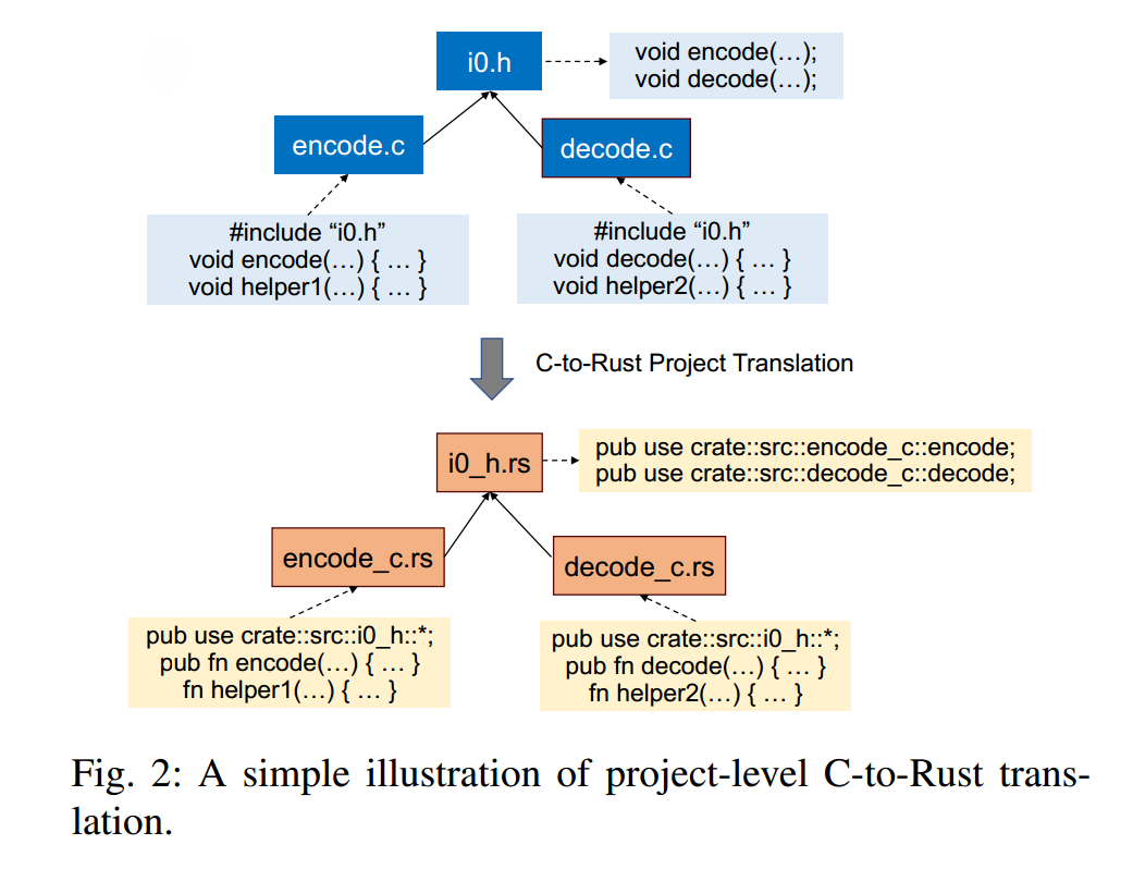 尽管多数现有方法聚焦于小规模的 C 代码翻译,近来的工作开始探索项目级 LLM 翻译。其做法通常是:先通过程序分析将 C 项目分解为基于依赖的翻译单元,再进行翻译并重新装配为可运行的 Rust 项目。