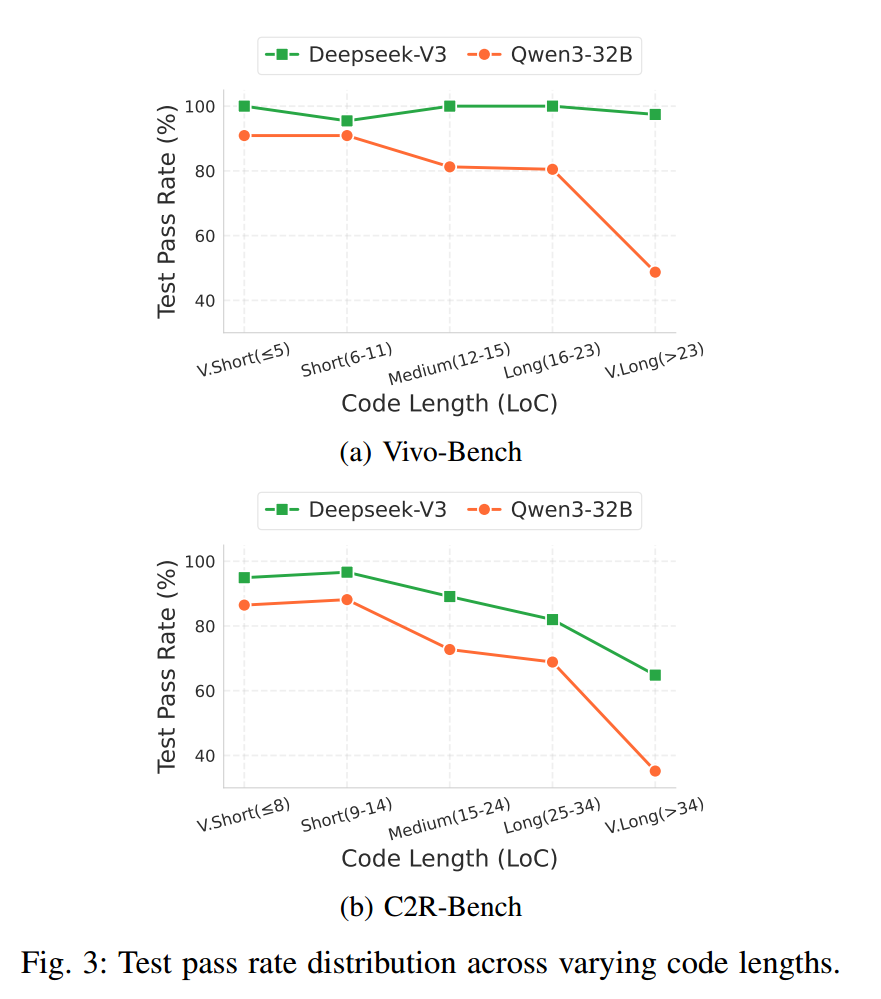 对 DeepSeek-V3,随着函数变长,测试通过率从 97.46% 降至 81.13%;