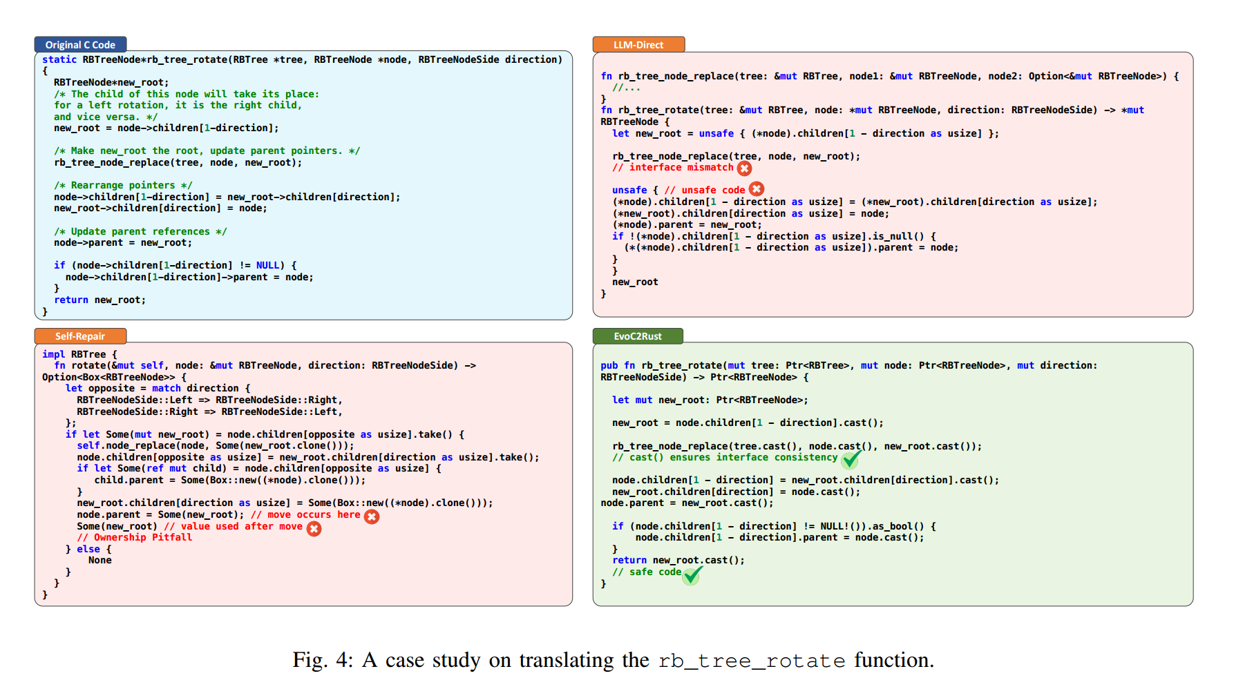 作为案例(见图4),展示 EVOC2RUST 的有效性。该函数涉及的复杂指针操作代表了低层 C 代码中最难以安全、正确翻译的一类场景,也揭示了其他方法常见的失效模式。