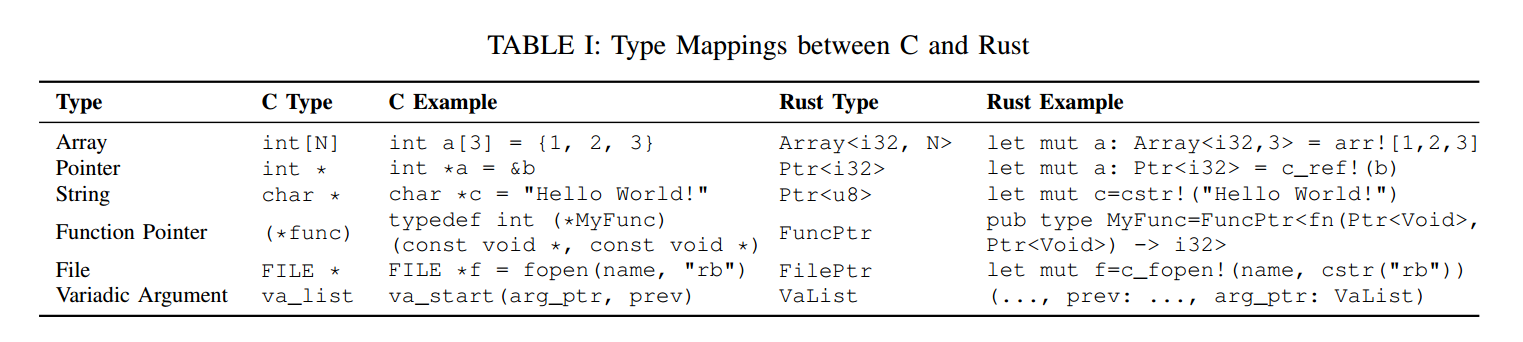 类型映射(Type Mapping)。对每一种 C 类型,我们都建立了一个对应的 Rust 类型(见表I)。例如,我们引入