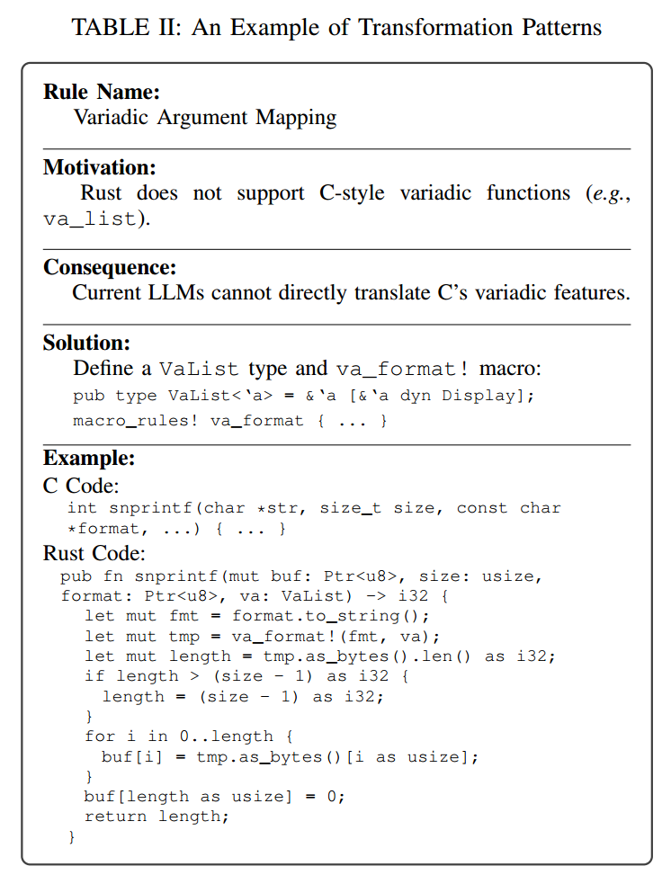 - 我们在 C 与 Rust 的核心语言要素之间定义了安全保持映射,以增强 LLM 的安全意识与约束遵循能力。