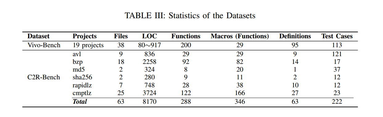 Vivo-Bench [21] 与 C2R-Bench 中的每个项目均包含 4 个关键组成:C 源码、C 测例、Rust 翻译结果以及对应的 Rust 测试用例。详尽统计见表III。