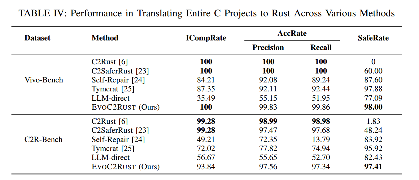 EVOC2RUST 的主要实验结果见表IV。它在两个数据集上全面优于所有基线方法,在三项综合指标上均取得最高分。