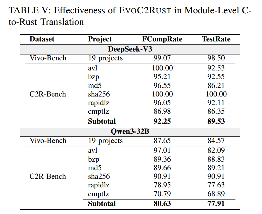 在 DeepSeek-V3 下,它在 Vivo-Bench 上达到 100% 编译通过与 99.07% 测试通过;在 C2R-Bench 上也保持稳健(92.25% 编译通过,89.53% 测试通过)。即便在参数量小 20× 的 Qwen3-32B 上,EVOC2RUST 仍取得可接受结果(80.63% 编译通过,77.91% 测试通过),显示出对模型规模的鲁棒性。