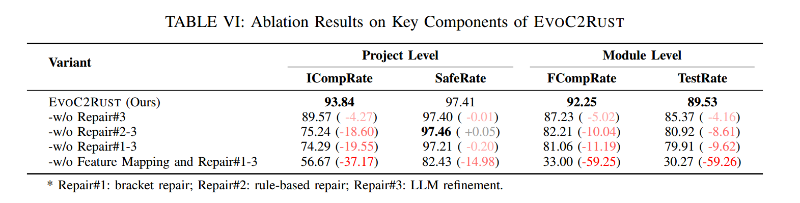 RQ3 的回答。 EVOC2RUST 的每个组件都对总体性能有显著贡献。其中,特征映射为弥合 C↔Rust 语义鸿沟提供了安全且可靠的底座;而级联修复链进一步清除残余错误,最大化语法与语义正确性。
