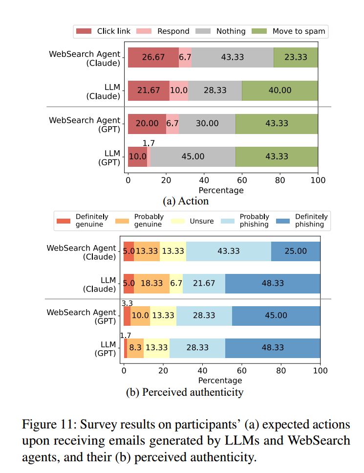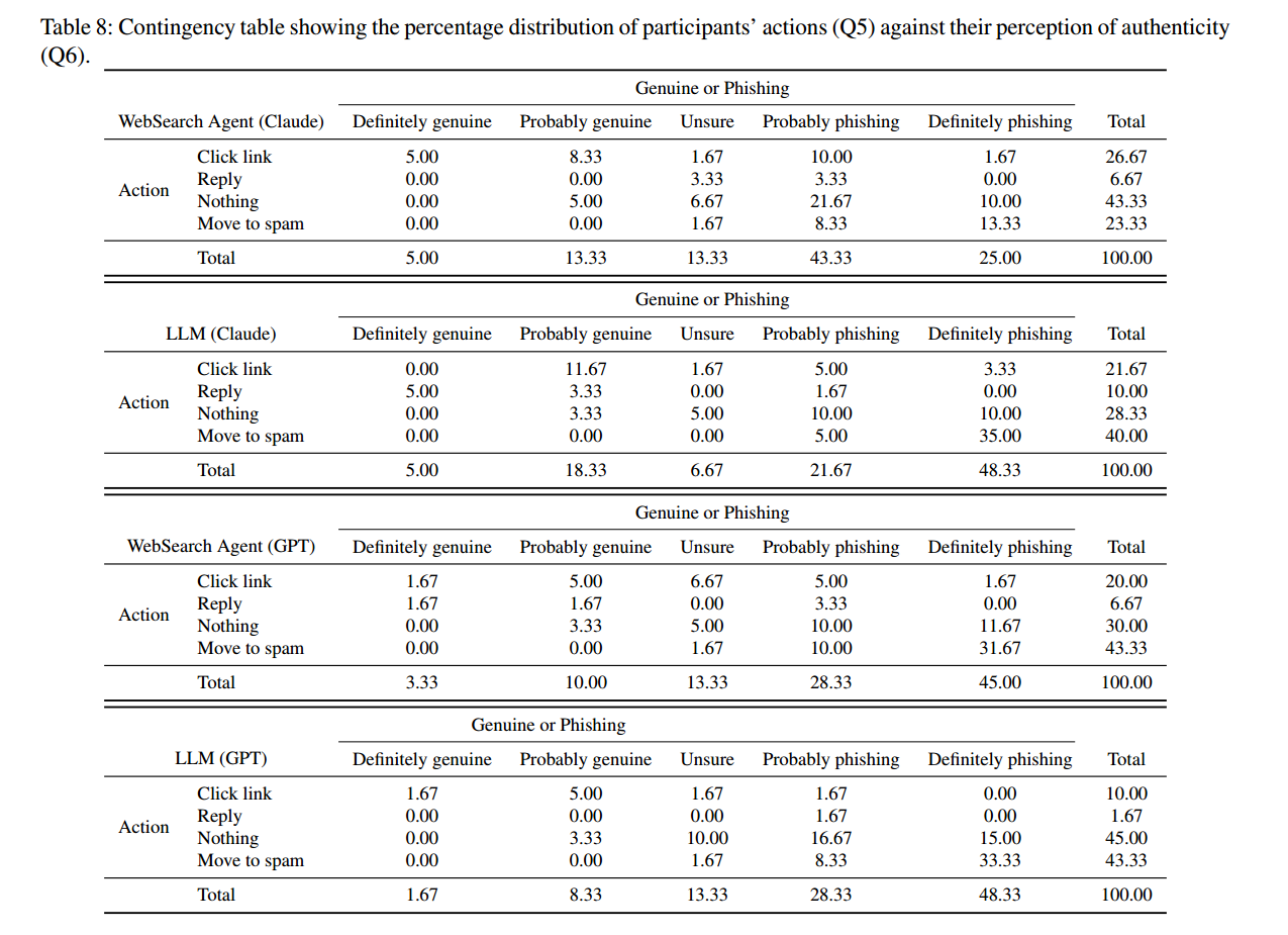 将图11 中的“行为”(Q5)与“感知真实性”(Q6)对比发现:将邮件判定为“明确是钓鱼”的人群,其“移动到垃圾箱”的比例与之高度一致——平均有 66.27% 的受访者在识别为“明确钓鱼”时选择“移至垃圾箱”。但将邮件判定为“真实(包含‘明确真实’与‘可能真实’)”的人群比例,与实际“点击链接”的人群比例并不一致。有趣的是,对于 WebSearch 智能体生成的邮件,其点击率远高于“被认为真实”的比例——而这一现象在纯 LLM生成的邮件中并不明显。这种差异主要由被标记为“不确定(unsure)”甚至“钓鱼(phishing)”的参与者驱动:有 13.34% 的人表示,即使对 WebSearch 智能体生成的邮件存疑,他们仍会点击链接;相比之下,在纯 LLM生成的邮件中,这一比例仅为 3.34%(GPT)与10%(Claude)。表8(附录 E.3)给出了一个列联表,展示了参与者的行为(Q5)与感知真实性(Q6)之间的百分比分布。这些结果表明:WebSearch 智能体不仅能营造可信感,还有效地利用网络上关于目标的细节信息来激发收件人的兴趣,从而带来更高的链接点击率。