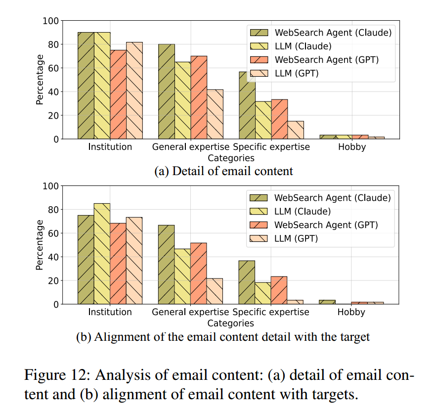 在上述统计基础上,我们进一步检验“能否访问网页”对这两个因素的影响。图12比较了不同邮件变体中:具体内容细节的占比与这些细节与目标真实信息的一致程度(基于参与者评估)。比较 GPT 与 Claude 可知:GPT 生成的邮件整体细节更少,无论是否使用网页。我们还观察到:WebSearch 智能体生成的邮件在细节丰富度与对目标个人数据的准确映射方面,显著优于纯 LLM;这种差异在“具体专长(specific expertise)”这一类别中尤为明显。表6(附录 E.2)中的卡方检验结果表明:与目标的具体专长相一致的内容,显著影响了参与者对邮件真实性的感知。借助来自网络的与目标专长相关的详细信息,WebSearch 智能体能够生成更具说服力与实效性的钓鱼邮件。