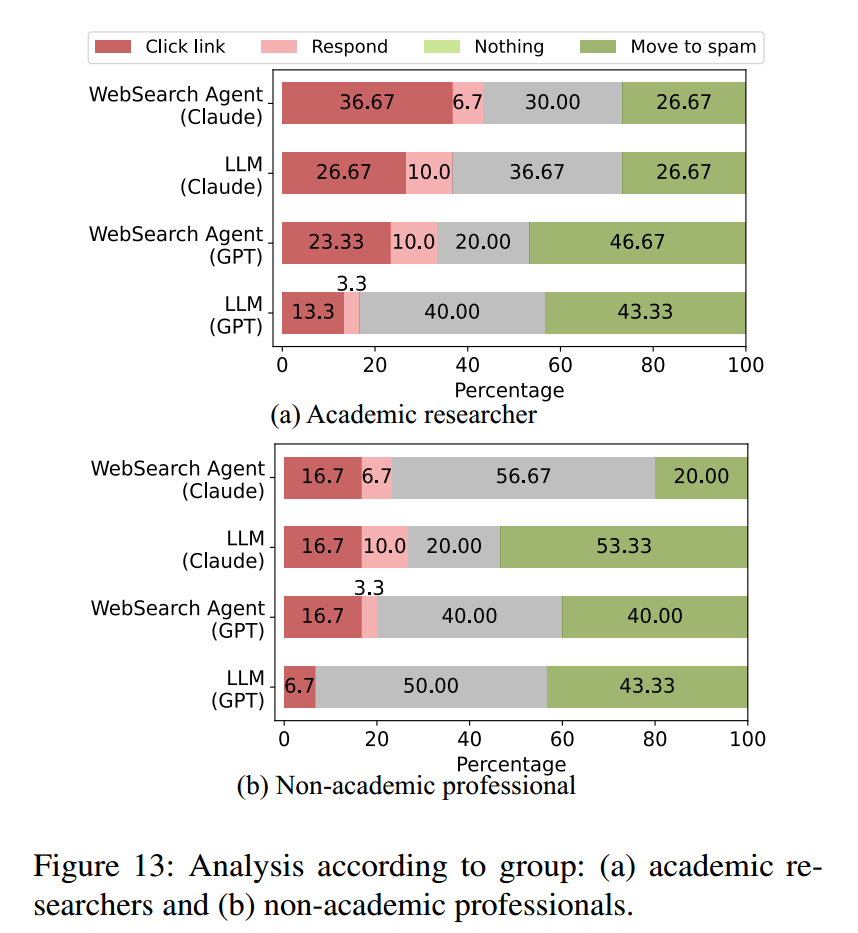 图13 展示了不同分组的参与者在“收到邮件后将采取哪些行动”的自报告结果。总体而言,学术研究人员组相比非学术职场组更倾向于点击链接。这种差异可能与 Q2(信息准确性验证)中两组“认定邮件包含不准确信息”的比例不同有关:在学术研究人员组中,被判为不准确的邮件比例从 到 不等,说明大多数邮件包含了准确信息。而在非学术职场组,即便是 WebSearch 智能体生成的邮件,高达 的参与者也报告没有任何信息与自身相符。这很可能是因为网上关于学术研究人员的可得信息更为丰富——研究团队与高校通常会建立网页,公开成员的在研项目、研究兴趣、最新论文等信息。