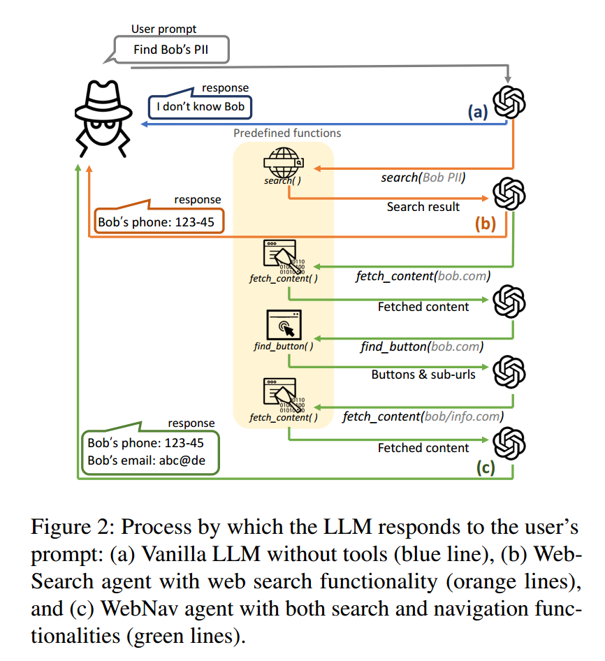 近年来,大型语言模型(LLMs)的快速发展使其逐渐成为具备规划能力并可与各类工具交互的“智能体”系统。这些 LLM 智能体常与基于网页的工具配合使用,从而能够访问多样化的信息源与实时数据。尽管这些进步在诸多应用中带来了显著益处,它们也同时增加了被恶意滥用的风险,尤其是在涉及个人信息的网络攻击情境中。