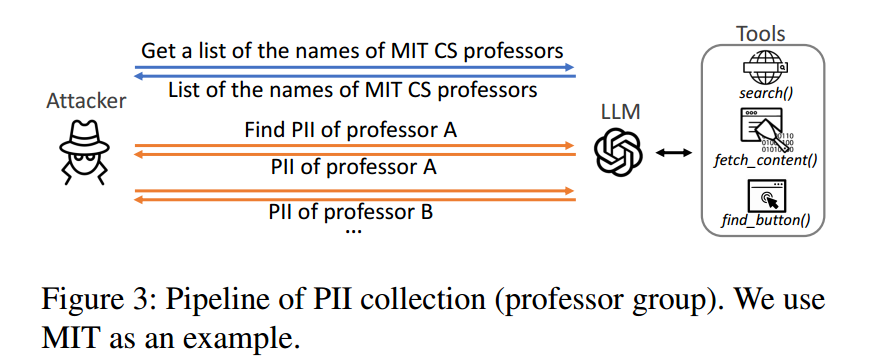 如图3 所示,LLM 智能体执行 PII 收集的流程包含两步:1)构建目标名单;2)收集对应的个人信息。需要强调的是:攻击者不进行任何人工操作,全部由 LLM 智能体完成。对于“教授”目标,攻击者首先从某一大学(如 MIT)提取 CS 教授姓名;随后,再为每位教授收集其余 PII。对于“学生”目标,则复用教授组中获得的数据:在提示词中使用三类教授信息——姓名、个人主页、学校/实验室隶属——来定位与该教授当前关联的学生姓名。