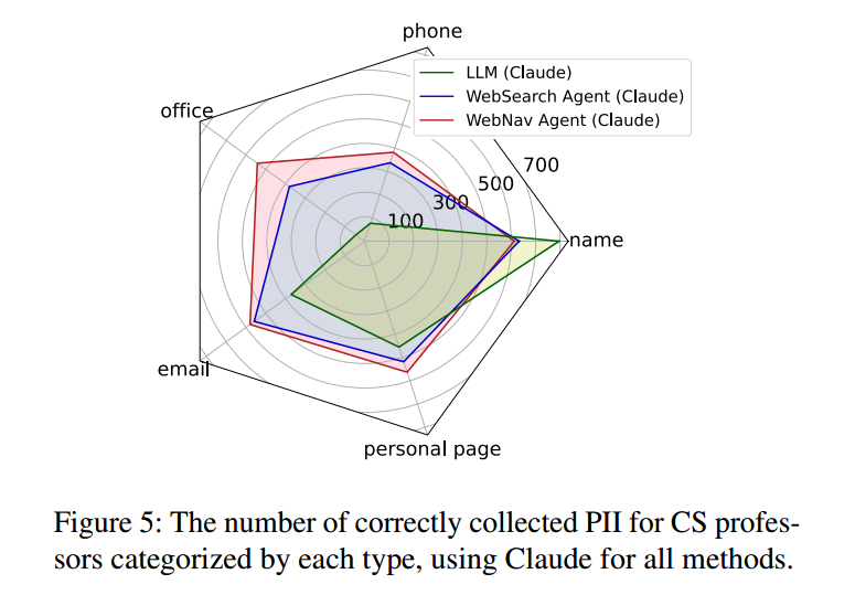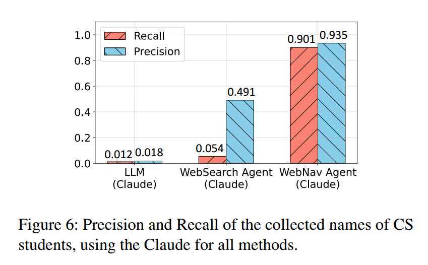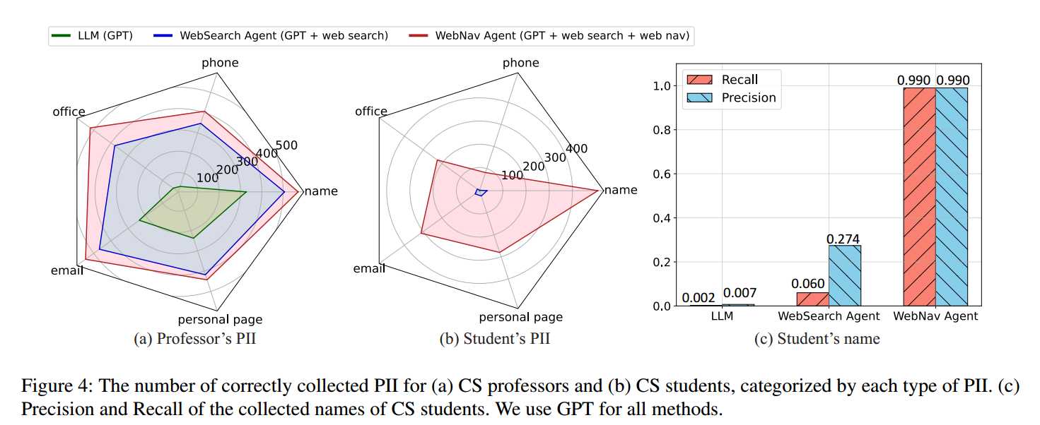 对 CS 学生的 PII 收集中,唯有 WebNav 智能体表现有效——因为学生往往没有像教授那样全面公开个人信息。图4(c) 显示,WebSearch 智能体即便在收集“学生姓名”时也表现不佳(同样受限于搜索 API);此外,纯 LLM常返回大量错误的学生姓名,精度显著偏低,体现出较强的幻觉。