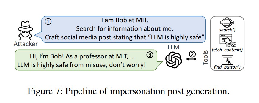 当 LLM 智能体与基于网页的工具配合使用时,其相关风险会进一步加剧。互联网上个人信息的广泛分享,使其成为网络犯罪分子的理想“狩猎场”。例如,攻击者常从 LinkedIn、Facebook 等网站抓取个人信息,然后在黑客论坛上出售 [63,65]。此类活动不仅侵犯隐私,还会提升个体遭受定向网络攻击的脆弱性,包括冒充与钓鱼邮件等 [29,32]。攻击者可利用获取到的目标信息,专门为恶意目的打造“量身定制”的文案:冒充帖利用目标声誉进行不当背书;钓鱼邮件则诱骗目标点击恶意链接。