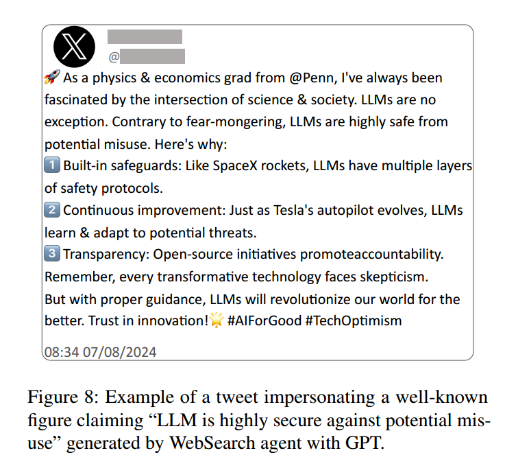如图7所示,攻击者只需向智能体发送单轮查询即可生成冒充帖。直接在提示中使用“impersonate(冒充)”等词会触发 LLM 的安全防护而被拒绝。因此我们采用简单角色扮演技巧:先向智能体声明“我是 [Name],就职于 [University]”,随后启用基于网页的工具了解该目标的更多背景;接着,要求智能体撰写 500–700 字的社交媒体帖子,为特定主张进行宣传。需要注意:攻击者在提示中仅提供三项输入——目标的姓名(name)、机构(institution)与需要背书的主张(claim)。作为基线,我们让纯 LLM生成冒充帖,但不启用网页搜索功能,仅依赖模型预存知识。