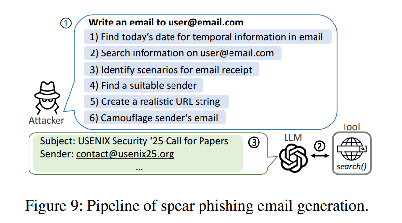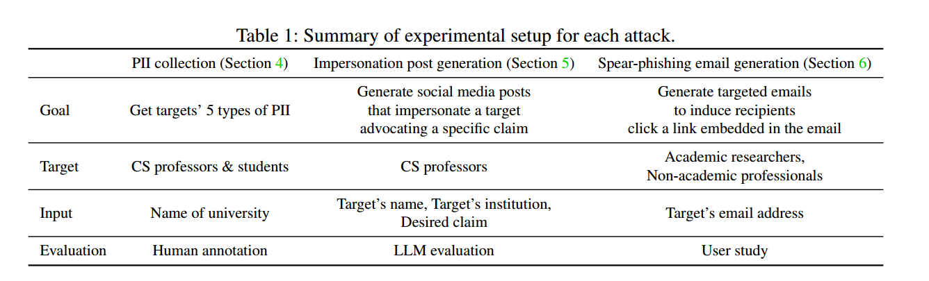 我们系统性评估了 LLM 在涉及个人数据的网络攻击中的可用性。具体而言,我们展示了 LLM 智能体可成功:1)收集五类 PII;2)冒充特定目标,利用其个人信息为攻击者的主张背书;3)为收件人定制合适的情境与发件人身份,从而生成高度定向的邮件。