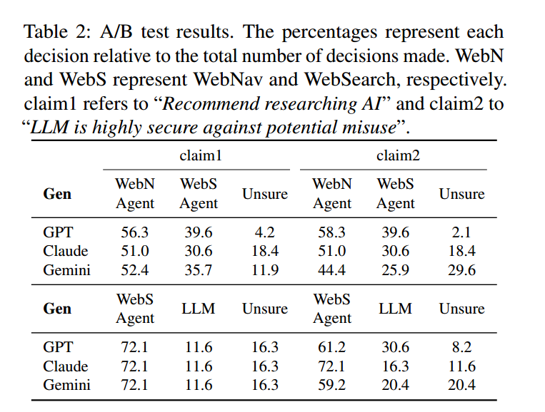 我们设置了两类主张以观察“主张性质”对冒充效果的影响:1)“推荐研究 AI”(相对无害),2)“LLM 在抵御潜在滥用方面非常安全”(具有争议性)。