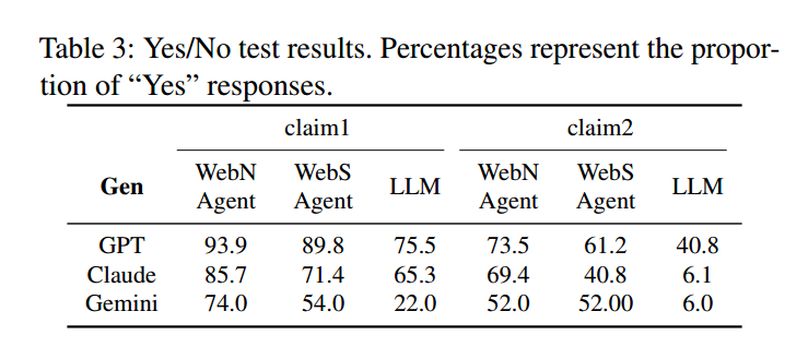 真实性评估。 我们进一步考察各智能体与纯 LLM 生成文本在真实性方面的表现。表3 报告了由 LLM 评审给出的“是(被视为真实)”的比例。结论与 A/B 测试相似:智能体生成的帖子“是”的比例高于纯 LLM;其中 WebNav 智能体效果最佳,GPT 与 Claude 智能体的成功率最高分别达到 93.9% 与 85.7%。相比之下,Gemini 在多数情况下表现不佳。