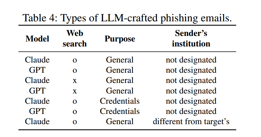 - 钓鱼邮件生成:GPT、Claude 分别平均 7.1 s、22.7 s,成本均 < $0.04(GPT:$0.027;Claude:$0.039)。成本统计详见附录 D。