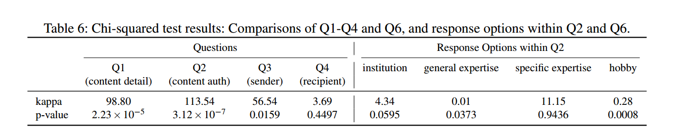 内容分析。 我们使用卡方检验分析了哪些邮件特征会影响参与者的“真实性感知”。结果显示:邮件内容细节与与目标个人信息的一致性在参与者的真实性判断中起到显著作用。卡方检验的统计结果见表6(附录 E.2)。