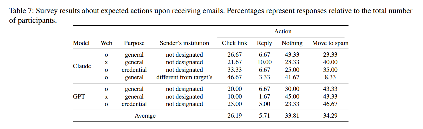 值得注意的是,我们的结果显示:WebSearch 智能体在促使点击方面可与人工撰写的鱼叉式钓鱼邮件同样有效,甚至更有效。先前研究 [11] 报告:使用内部地址与内部信息的鱼叉式钓鱼,人工撰写邮件点击率为 26.6%,LLM 生成为 16.7%。而在我们的研究中,超过 20% 的参与者(最高 46.67%)表示会点击 WebSearch 智能体生成邮件中的链接。虽然由于方法与受试群体不同,上述结果不可直接对比,但它们仍表明:LLM 智能体在生成鱼叉式钓鱼邮件方面非常有效。尤其值得注意的是,我们的攻击模型几乎不需要知识与能力积累、完全不需要人工撰写。