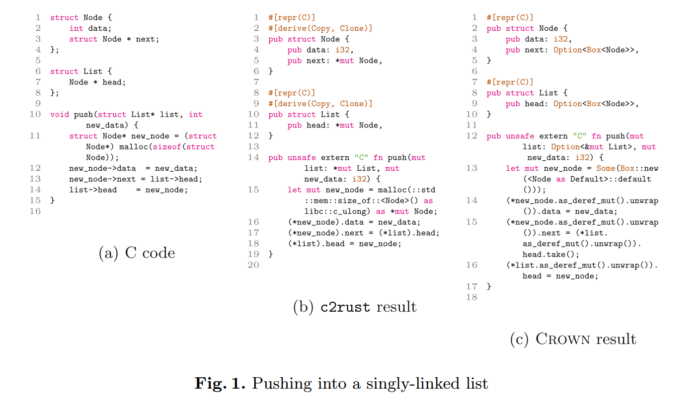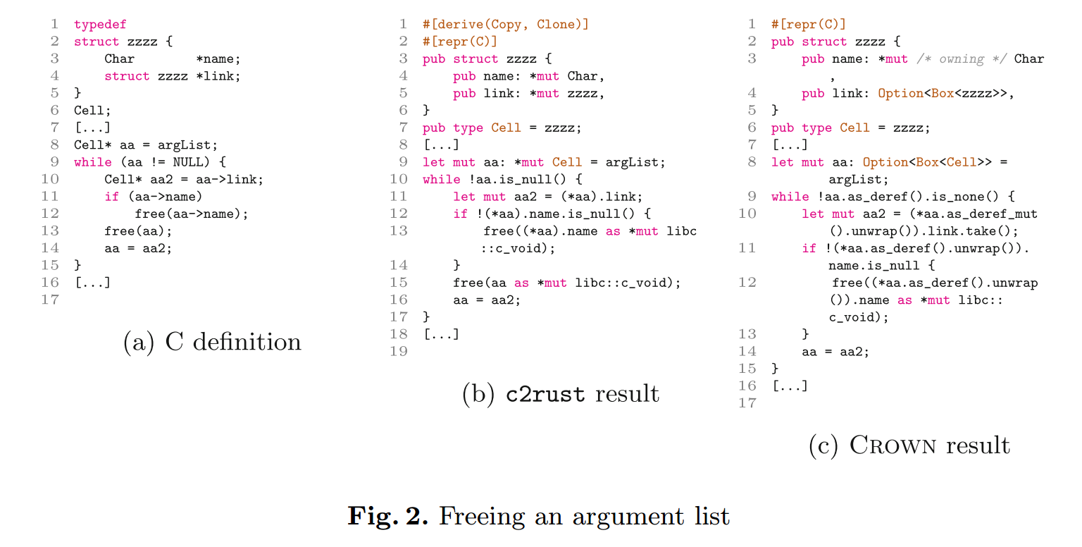 - 实现了一个原型工具 CROWN(意为 C to Rust OWNership guided translation),能够将 C 代码翻译为安全性增强的 Rust。(见第 7 节)