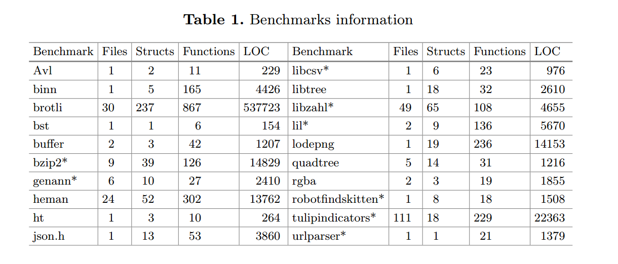 - 使用一个基准套件对 CROWN 进行评估,该套件既包含常用的数据结构库,也包含真实世界项目(规模从 150 行到 50 万行不等),并将结果与当前最先进的方法进行比较。(见第 8 节)