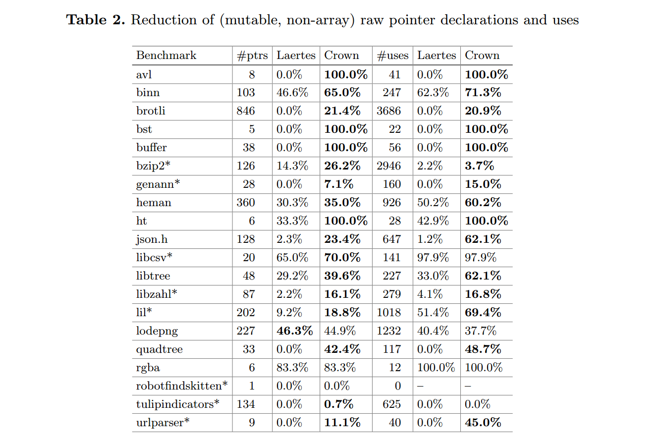 - RQ1. CROWN 能将多少裸指针/指针用法翻译为安全指针/安全指针用法?